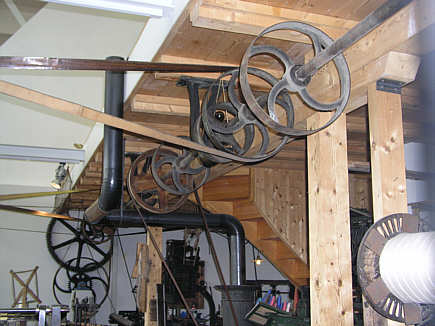 Das Wasserrad erzeugte eine Drehenergie, die auf eine Welle übertragen wurde. Diese Bewegung wurde durch Übersetzungen (im Bild unten an der Wand) auf feststehende Wellen und Scheiben und von da mit Lederriemen auf andere Wellen umgeleitet.