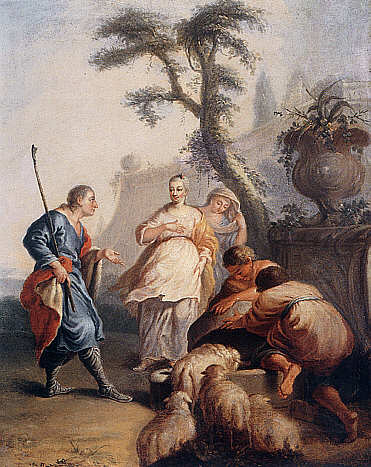 | Franz Anton von Leydensdorff: Allegorie auf die Schwangerschaft Elisabeth Augustes, 1761 Übertragung der familiären Situation des Kurfüstenpaares ins Biblische: Nach 1. Buch Mose, 39, 9-10, begegnet Jakob am Brunnen seiner Cousine Rahel, wälzt einen Stein vom Brunnen, lässt ihre Tiere tränken und gibt sich ihr zu erkennen. Wie Jakob muss auch Carl Theodor lange auf den ersehnten Sohn warten. Die Schwangerschaft der Kurfürstin setzte nach fast zwanzigjähriher Ehe den Hoffnungen des Kurfürsten auf einen Erben ein Ziel und wurde von der ganzen Bevölkerung mit Bittgebeten unterstützt. Das Kind starb jedoch unmittelbar nach der Geburt, die Kurfürstin musste auf Anraten der Ärzte auf eine erneute Schwangerschaft verzichten. |