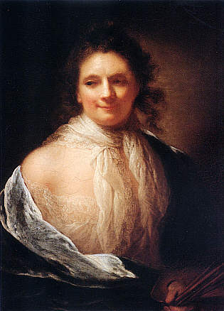 | Anna Dorothea Therbusch: Selbstbildnis, 1761 Das Selbstporträt zeigt die Malerin in selbstbewusster Haltung mit Palette und Pinsel, frontal dem Betrachter zugewandt, in lockerer und verspielter Pose. Das dunkle ungepuderte Haar fällt lockig auf die Schultern. ie Schultern sind frei, das Dekolleté wird vom einem um den Hals geschlungenen Tuch verdeckt. |