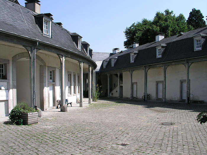 Der Innenhof (hier des westlichen Zirkelbaus) zeigt die Anordnung der Bauteile entlang des Viertelkreises (links) und der Winkelseiten (rechts)