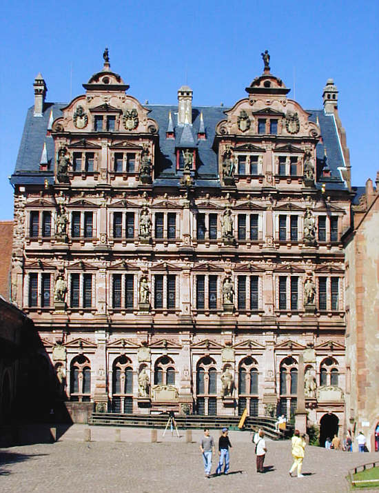 Friedrichsbau, erbaut 1601 - 1607 unter Kurfürst Friedrich IV., mit der Ahnengalerie der Kurfürsten in der Fassade. Im Erdgeschoss die noch unzerstörte Schlosskirche, darüber Wohnräume.