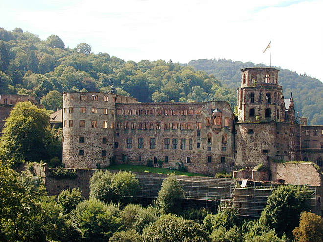 Ostbefestigung des Schlosses, ursprünglich aus dem 15. Jahrhundert stammend, mit Glockenturm (rechts) und Apothekerturm (links). Dazwischen die Rückseite des Ottheinrichsbaues und der rückseitige Giebel des Gläsernen Saalbaus