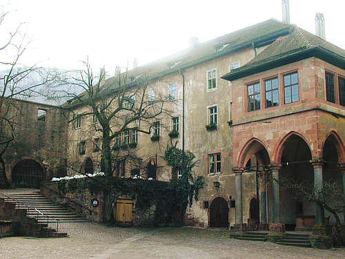 Schmuckloses Gebäude an der Südseite des Hofes, erbaut unter Kurfürst Ludwig V. (1501 - 1544). Rechts am Rand die Brunnenhalle