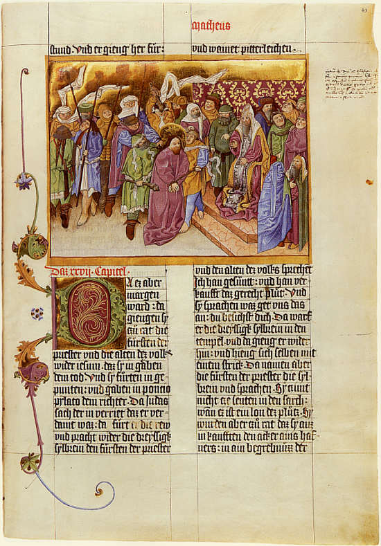 Handschrift des Neuen Testaments in ursprünglich 8 Bänden aus dem 2. Viertel des 15. Jahrhunderts, 1530 von Pfalzgraf Ottheinrich erworben und in seinem Auftrag von Matthias Gerung fertig ausgemalt