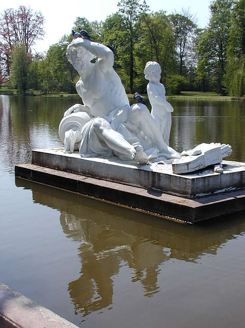 An den vier Ecken im Zentrum des großen Weihers waren ursprünglich die Allegorien der vier kurpfälzischen Flüsse als Flussgottheiten geplant. Ausgeführt wurden nur die beiden vorderen, zum Park hin, Rhein und Donau. Hier: Die Donau