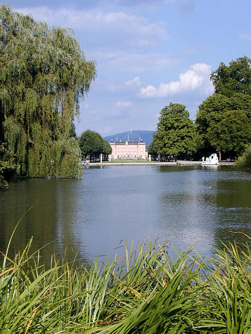 Blick von der Rückseite des großen Weihers in die zentrale Achse des Schlossgartens. Rechts der Flussgott der Donau, im Hintergrund die Spitze des Königstuhls als das Ende der Achse.