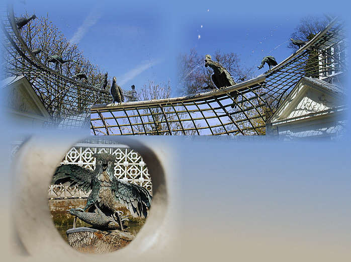 farbig gefassten wasserspeienden Vögeln, die ihren Strahl