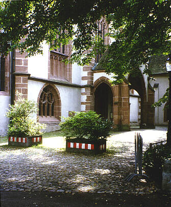 Rechts von der Kirche die Halle mit den Grabmälern Basler Familien, links der Lohnhof.