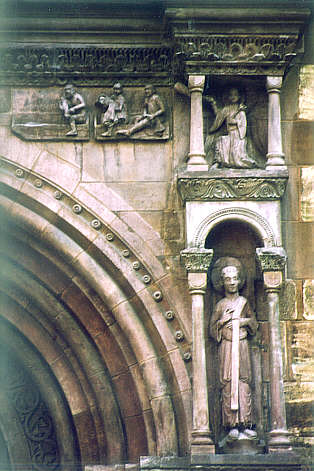 obere rechte Ecke des Figurenschmucks: Apostel (Johannes?), darüber zum Jüngsten Gericht blasender Posaunenengel und sich aus dem Grab erhebende Auferstehende
