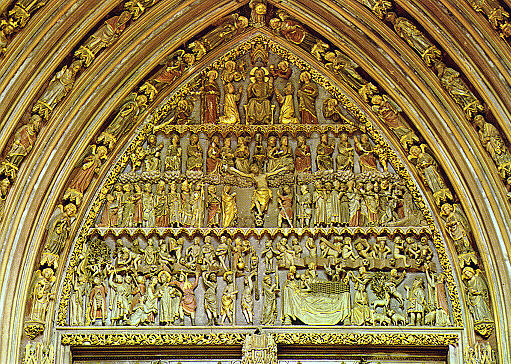 Das Figurenfeld erzählt die Jugendgeschichte Christi, die Passion und das Jüngste Gericht. Dreizoniger Aufbau mit dem thronenden Christus als Weltenrichter im obersten Feld, neben ihm Maria und Johannes und die Engel mit den Leidenswerkzeugen.