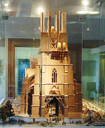 Das Modell des Münsterbaus zeogt die Kirche zum Zeitpunkt des Langhaus-Neubaus im 13. Jahrhundert. Romanishcer Chor und Querhaus sind ebenso vollendet wie die unteren Geschosse des Turms. Das Langhaus ist noch im Bau.