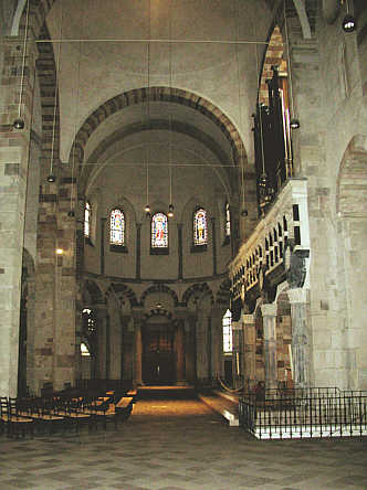 Salierzeitlicher Umgangschor aus der Mitte des 11. Jahrhunderts, Obergaden der Chorkonchen Mitte des 12. Jh. erneuert Rechts der Renaissance-Lettner.