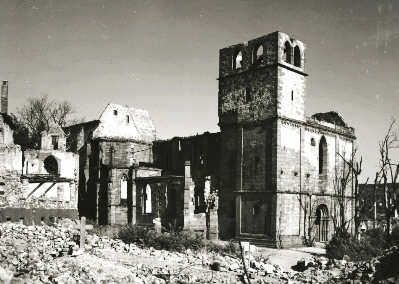 Ansicht der beim Angriff auf Pforzheim am 23.2.1945 zerstörten Schlosskirche. Bild 1.4.1945