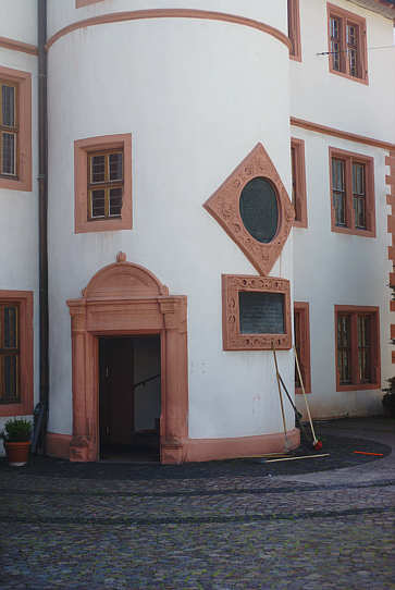 Treppenturm des 1579 errichteten Universiätsbaus mit Renaissance-Portal und Inschriftplatten in Renaissance-Umrahmung