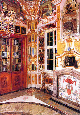 Appartement der Markgräfin Mit kostbaren Spiegeln ausgestatteter Raum zwischen Spitzenzimmer und Paradeschlafzimmer. Über der Tür Faksimiles der Kostümbilder (jetzt im 3. Stock ausgestellt)