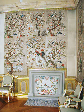Appartement des Erbprinzen Wandbespannung mit Papiertapete im chinesischen Stil und Kaminplatte mit chinesischem Motiv.
