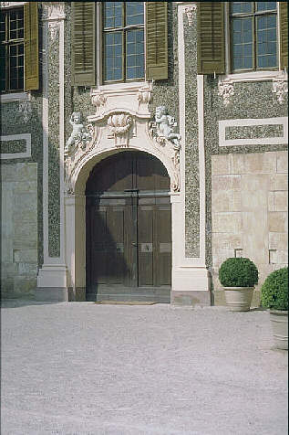 In den Putz des Gebäudes sind Rheinkiesel eingebettet, so dass sich