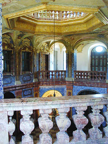 Schloss FavoriteErste Galerie der Sala Terrena Umgang im ersten Obergeschoss des Schlosses mit Balustrade aus Stuckmarmor zur Sala Terrena. Links im Bild die Fenster des Speise- und Audienzzimmers der Markgräfin. |