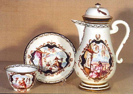 | Zum reichen Favoriter Bestand der Porzellane mit Chinoiserien im Stil des Johann Gregorius Höroldt, dem die Meißener Manufaktur nach seiner Berufung im Jahr 1720 das Gelingen der Farbdekoration in Muffelfarben verdankte, zählen zwei besonders fein gemalte Kaffee- und Teeservice, die die Markgräfin möglicherweise ihrem Sohn Ludwig Georg etwa zu seiner Hochzeit oder bei seinem Regierungsantritt im Juli 1727 zum Geschenk machte. | |||||||||