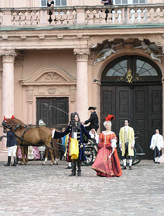Markgraf Ludwig Wilhelm und Markgräfin Sibylla Augusta nehmen die Huldigungen des Volkes entgegen, bevor sie das Schloss betreten.