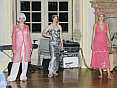Anneliese Almasan (Schlösser & Gärten) und Ulrich Reich (Service-Center Rastatt, rechts) im persischen Kostüm, Thomas Angelou (Service-Center Rastatt) in einer indisch inspirierten Seidenkreation bei der Begrüßung der Gäste
