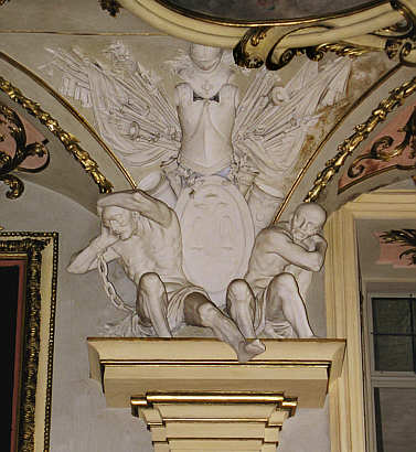 Stuckfiguren als Bekrönungen der Kolossalpilaster: