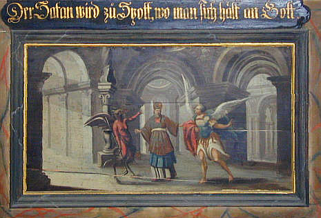 Bildfelder mit gereimten Lehrsprüchen: Der Satan wird zu Spott / wo man sich hält an Gott