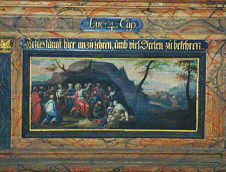 Bildfelder mit gereimten Lehrsprüchen: Jesus fängt hier an zu lehren / umb viel Seelen zu bekehren