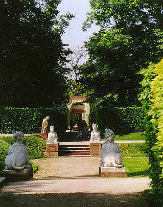 Schlossgarten SchwetzingenAuf dem Weg zum BadhausJenseits des Theaters scheint eine Mauer den Garten zu begrenzen und ein neuer Pfad zwischen hohen Hecken nimmt den neugierigen Besucher auf. Der Blick wendet sich nach links und trifft den Tempel des Musengottes Apoll |