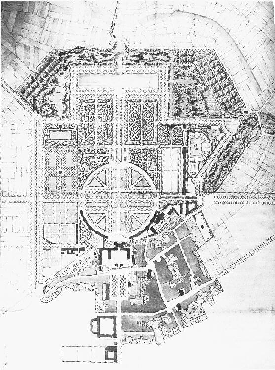 Das Schloss mit den beiden Zirkelbauten ist unten, der Zirkel ist bereits durch den hinteren teil mit dem großen Bassin erweitert. Nach Südwesten ist ein großer Jagdstern geplant, der in einem seiner Planungsstadien mit einem Belvedere an den Garten angeschlossen werden sollte. Diese Planung gedieh nicht über die Anlage des Wald-Zirkels hinaus.