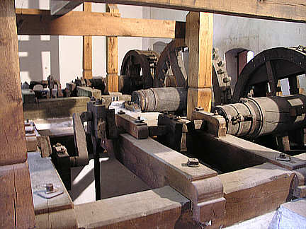 Rechts eines der beiden Treibräder, daneben die davon angetriebenen Wellen für die Pumpen, die das Grundwasser nach oben in die Wasserbehälter förderten.