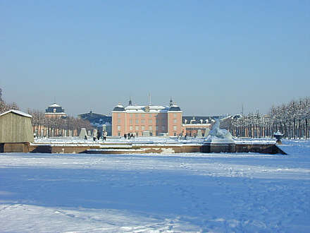 Blick über das Parterre zum Schloss. Im Vordergrund die Hirschgruppe (die linke Figur ist eingehaust).