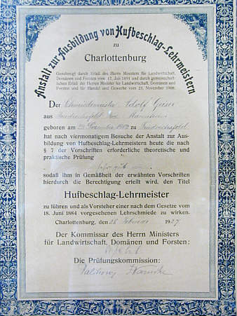 Meisterbrief als Hufbeschlag-Lehrmeister, 1927