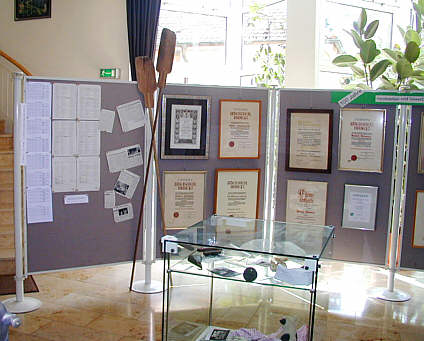 Stellwände mit einer Liste der Gewerbetreibenden des Ortes 1971, fortgeschrieben 2001 (links), zeigt den Schwund an. Rechts daneben Meisterbriefe. Im Vordergrund Vitrine mit Geräten des Metzgers |
