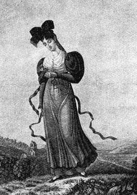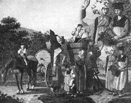 In der weiteren Entwicklung wurde zunächst die Schleife etwas mehr aus dem Kappenboden herausgehoben, dann wurde die Kappe zum kleineren Käppchen, das nur noch den Zweck hatte, den Haarknoten oder "Drüller" der Frau zu umschließen. Die Schleife verschiebt sich dann immer mehr zur vorderen Kopfhälfte und wird zur Stirnmasche, die über der Stirn hochgezogen und verschlungen wird und die Bandenden in das Gesicht herabfallen lässt Bild: Weinlese bei Müllheim, Kolorierte Lithografie, um 1820 |