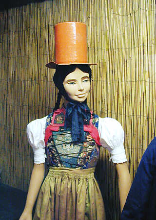 Frauentracht mit Strohzylinder, dazu ein über der Brust geschnürtes Mieder.