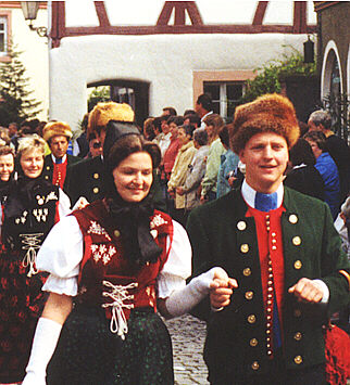 | Der Mann trägt einen grünen Kittel, eine rote Weste und eine Fuchspelzkappe, ein weißes Hemd mit blauer Krawatte, dazu eine rote Weste und eine grüne Jacke. Zur schwarzen Kniebundhose werden weiße Kniestrümpfe und schwarze Schuhe getragen. | Die jungen Frauen tragen zum schwarzen Rock ein besticktes Mieder mit Goller und Stecker, ebenfalls weiße Kniestrümpe und schwarze Schuhe. Den Kopf bedeckt eine schwarze Bänderkappe mit Stickerei | nächste Gruppe: Odenwälder Trachtengruppe Buchen |