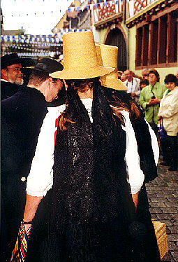 sind die hohen Strohhüte der Frauen. Sie werden am Kinn mit roten oder