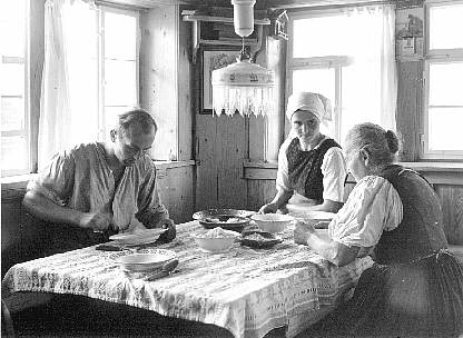 Das Bild trägt im Original den Titel (1935, zeitgebunden) "Im Hanselebure-Hof nimmt das Maidle mit Mutter und Knecht seine einfache Mahlzeit"