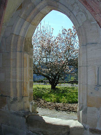 Blick aus einer der Kreuzgangarkaden in den ehem. Kreuzgarten