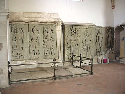 Im einheitlichen Stil Anfang des 16. Jahrhunderts geschaffene Grabplatten der Niederadelsfamilie Wöllwarth im nördlichen Querschiff