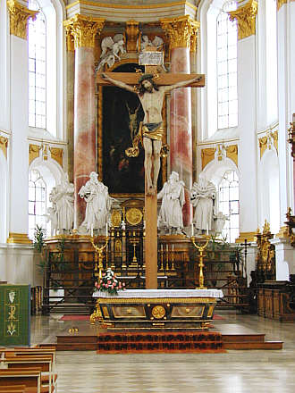 Davor der Kreuzaltar mit einem Kruzifixus aus dem Ulmer Münster (Anfang 16. Jahrhundert).