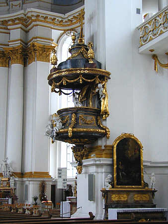 Am Übergang vom Langhaus zur Rotunde die Kanzel, ein Werk von Benedikt Sporer nach einem Entwurf von Januarius Zick, mit Stuckarbeiten von Martin Dreyer, zu der auf der anderen Seite die Gruppe "Aussendung der Apostel" von J. G. Schneck ein Gegengewicht bildet.