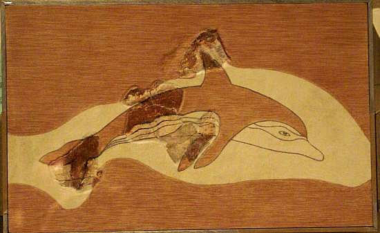 Oben: Rekonstrierte Wandmalerei eines Delphins |
