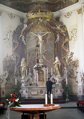 Hochaltar von 1760, mit einer Kreuzigungsgruppe von J.J. Christian