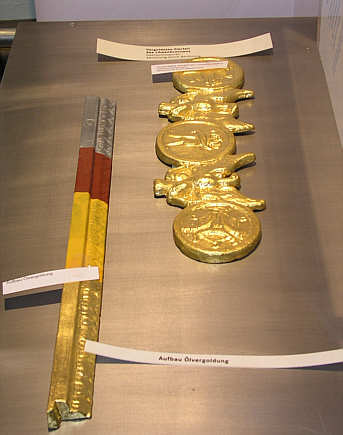 Im Bild der Aufbau einer Ölvergoldung (links) und ein Zierat