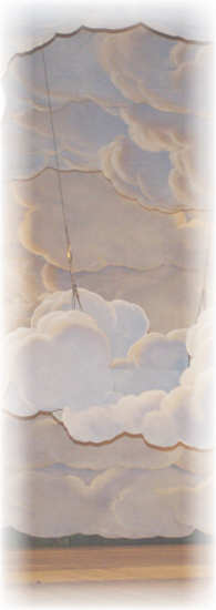 ZUR BAUWEISE: Die Rahmen der Wolkendekoration sind aus Fichtenholz gebaut und mit belgischem Rohleinen bespannt. Die einzelnen Rahmenelemente sind durch einen eingeschlagenen Schwalbenschwanz miteinander verbunden, eine reine Holzverbindung, lediglich die Aufhängung besteht aus je zwei gebogenen brünierten Bandeisen. Der frei hängende, nicht vom Rahmen gestützte Stoff der Malerei ist mit einem eingenähten Bleiband versehen, um besser aushängen zu können.