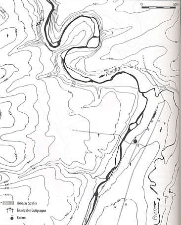 Siedlungsentwicklung Gräber des 7. und 8. Jahrhunderts in der Umgebung Rottweils. Nördlich der früheren römischen Siedlung liegen zahlreiche alemannische Gräber, die aber eher als kleinere Gräbergruppen oder Familienbestattungen als als Reste einen großen geschlossenen alemannischen Gräberfeldes zu deuten sind. |