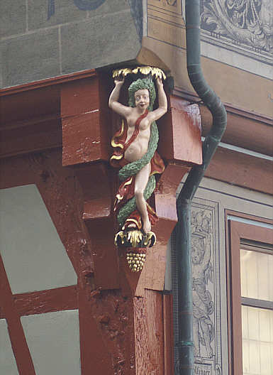 Konsolfigur an der Südostecke des Rathauses: Von einer Girlande und einem roten Tuch umwundene Frau, auf einer vergoldeten Weintraube stehend