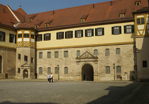 Schlosshof Ostflügel des 16. Jahrhunderts mit schlichter Fassadengestaltung. Die oberen Stockwerke werden durch außen iegende Wendeltrppen erschlossen. Die Portale im lombardischen Stil wurden z.T. erneuert.